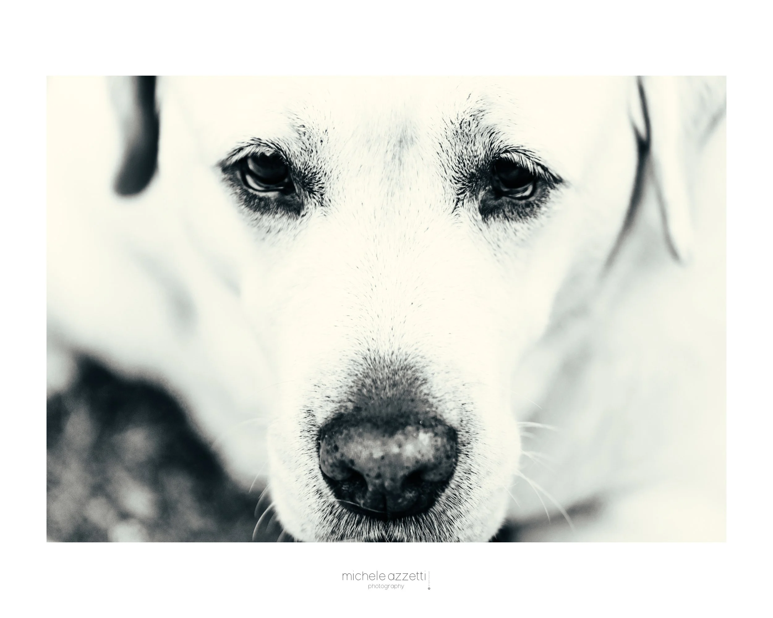 Primo piano di un cane bianco con occhi scuri in bianco e nero, con attenzione ai dettagli del muso e del naso.