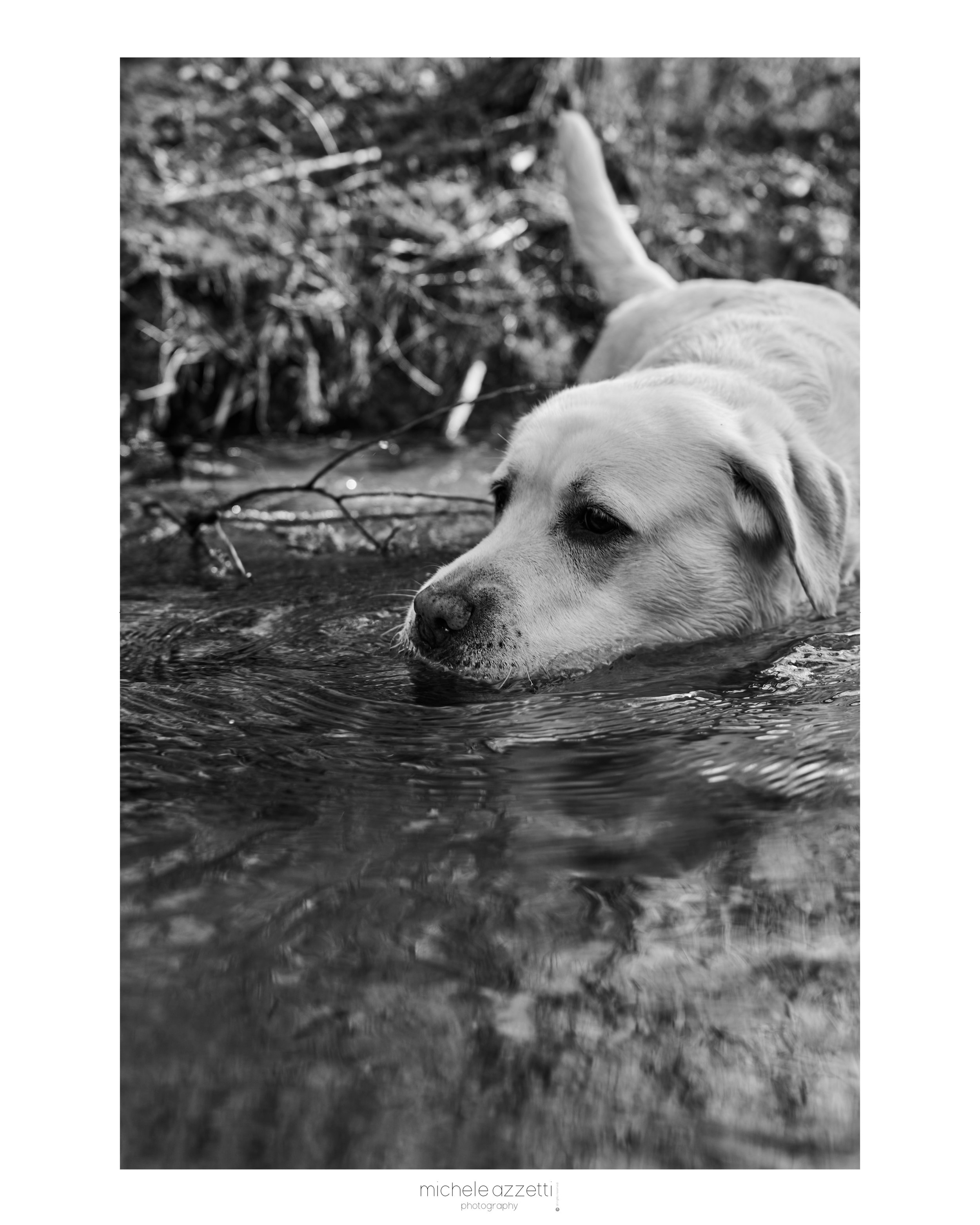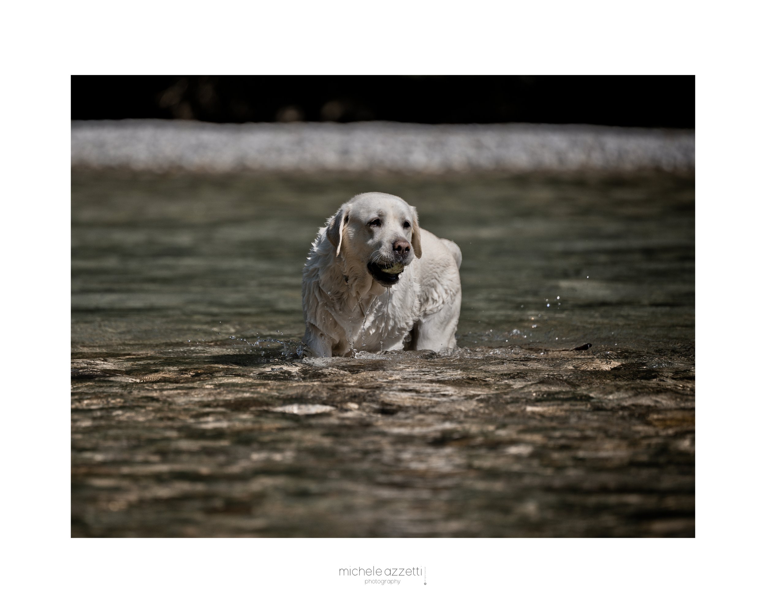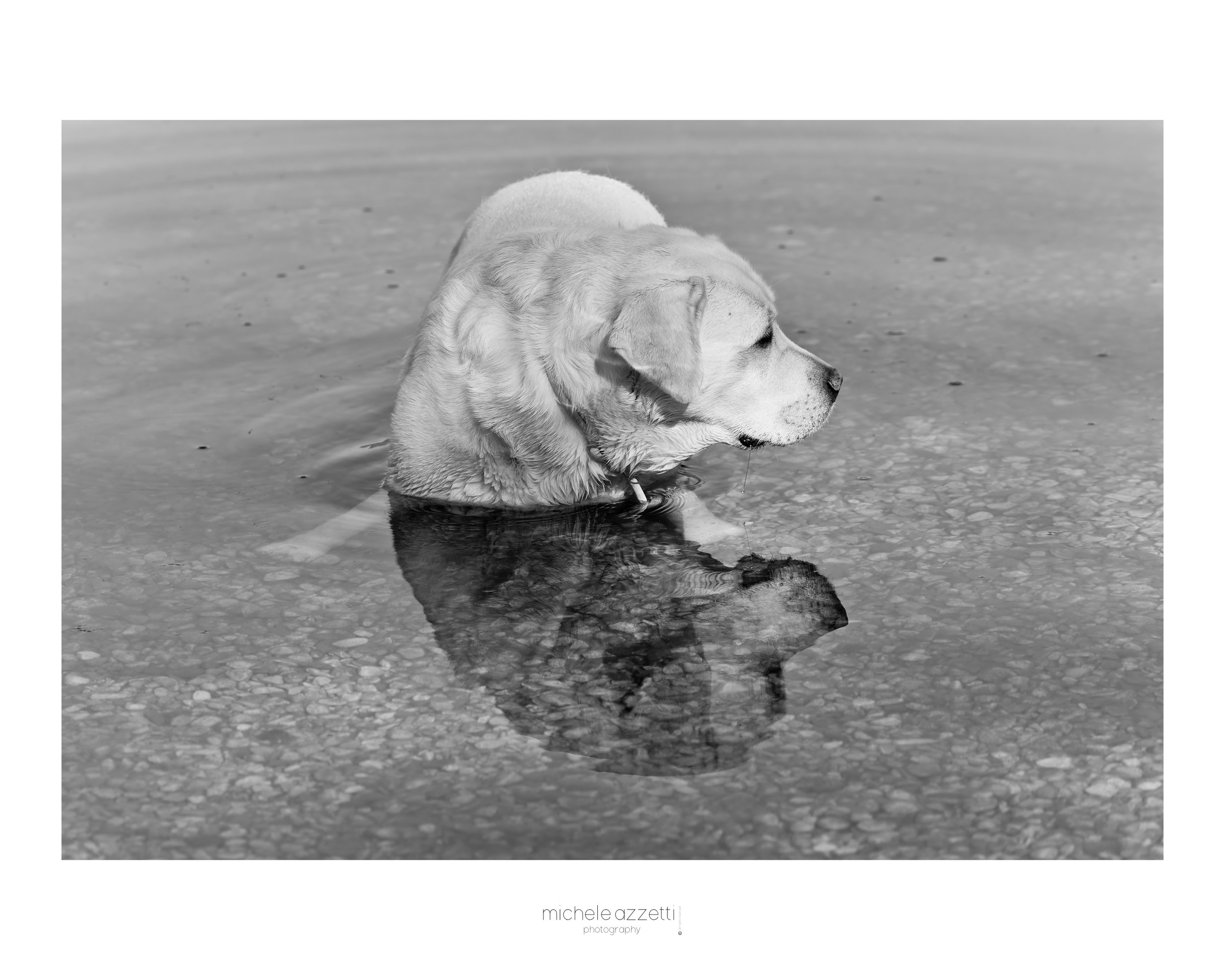 Un cane di colore chiaro è immerso in acqua e si guarda verso la fotocamera, con riflesso visibile nell'acqua