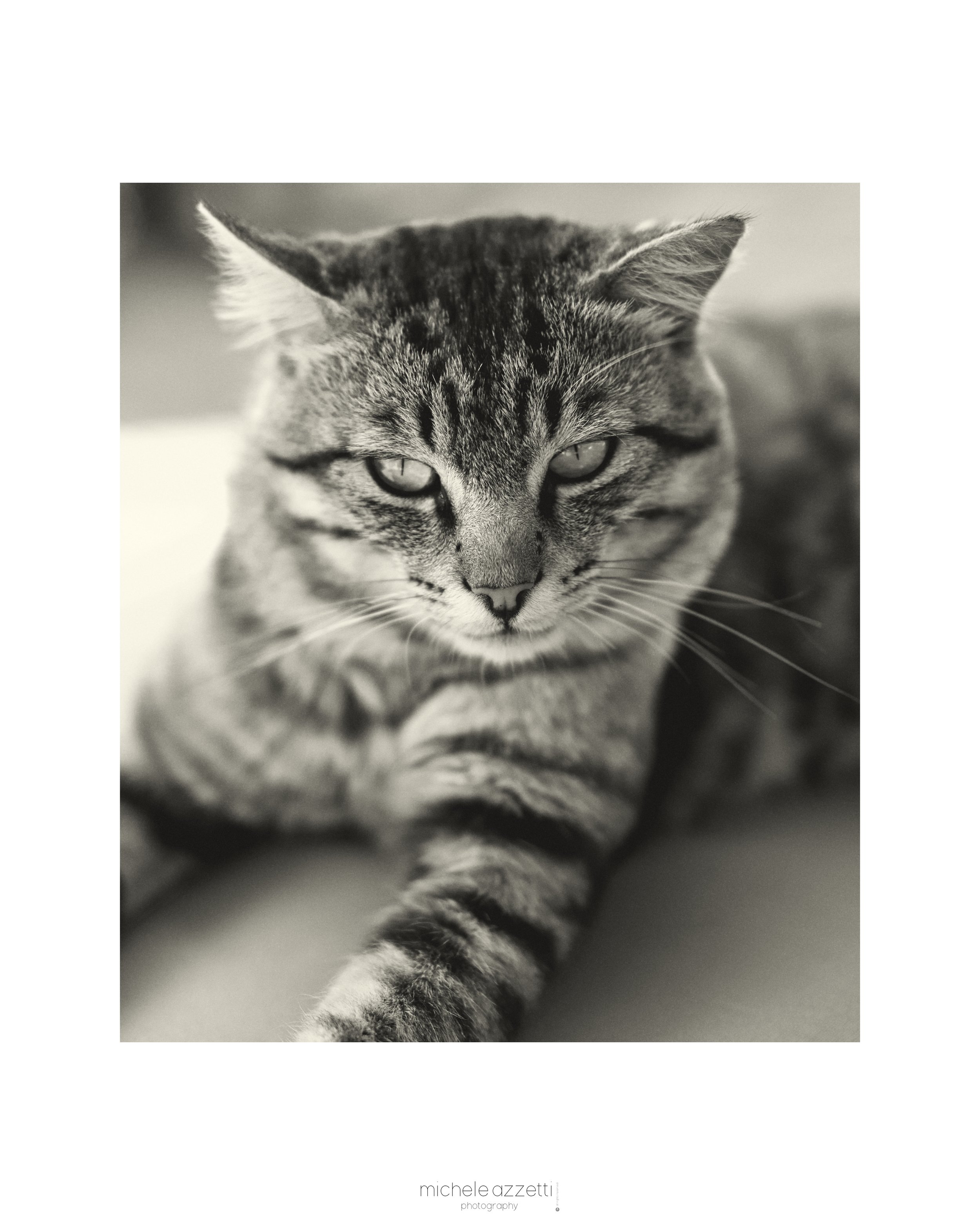 Gatto tigrato seduto, in primo piano, in bianco e nero