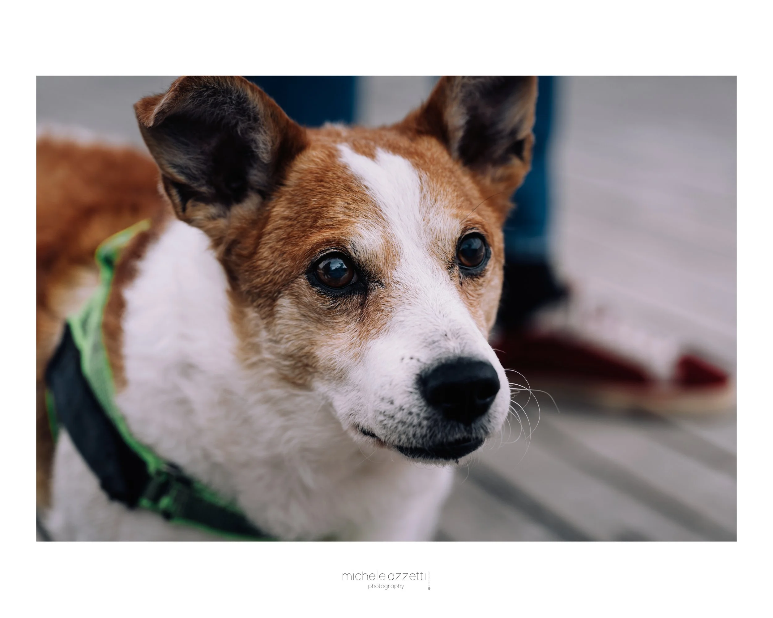 Un cane con pelo bianco, marrone e nero, che guarda verso sinistra, con uno sguardo attento