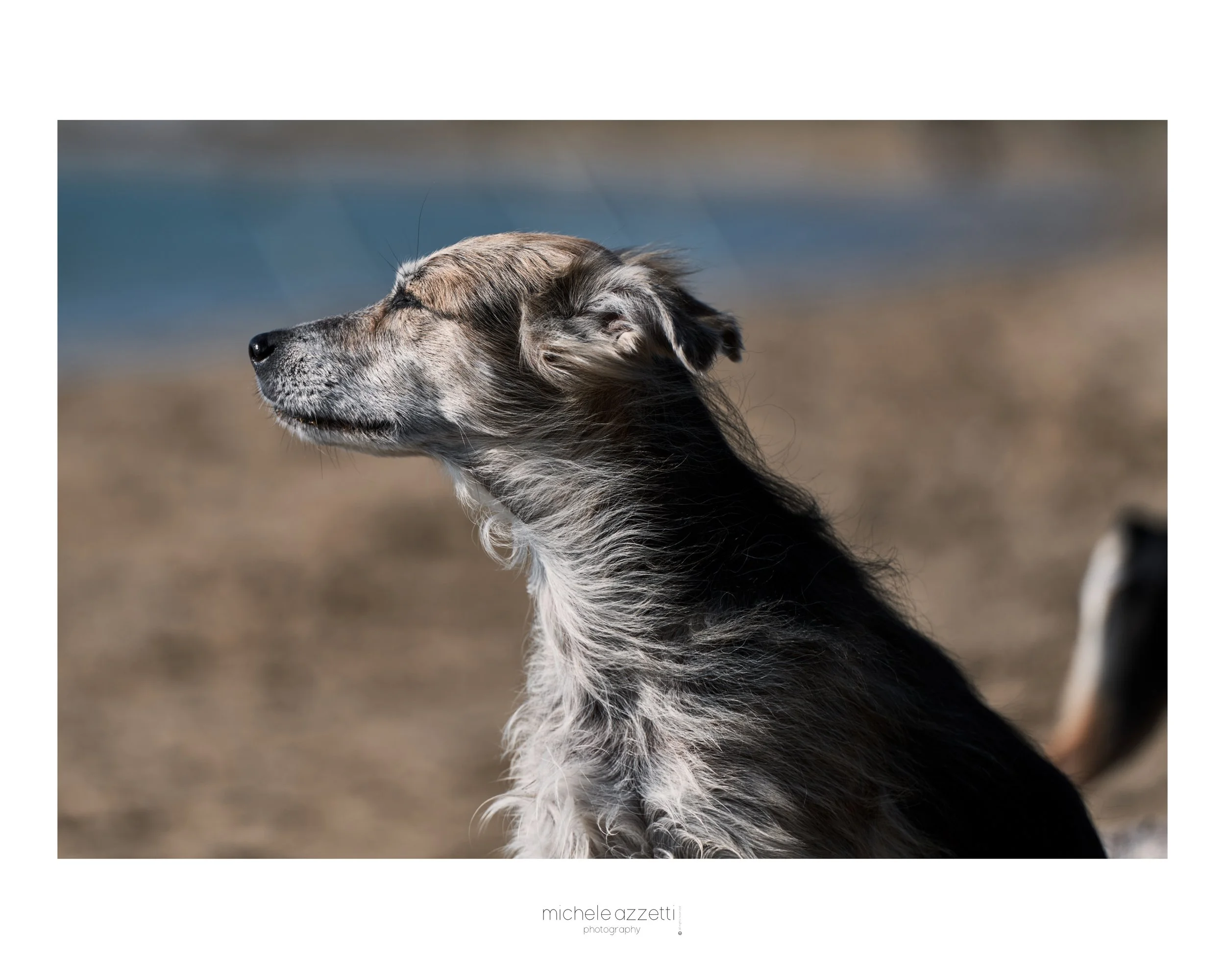 Un cane con pelo lungo e tigrato che si rilassa con gli occhi chiusi al sole, sfondo di un paesaggio all'aperto.