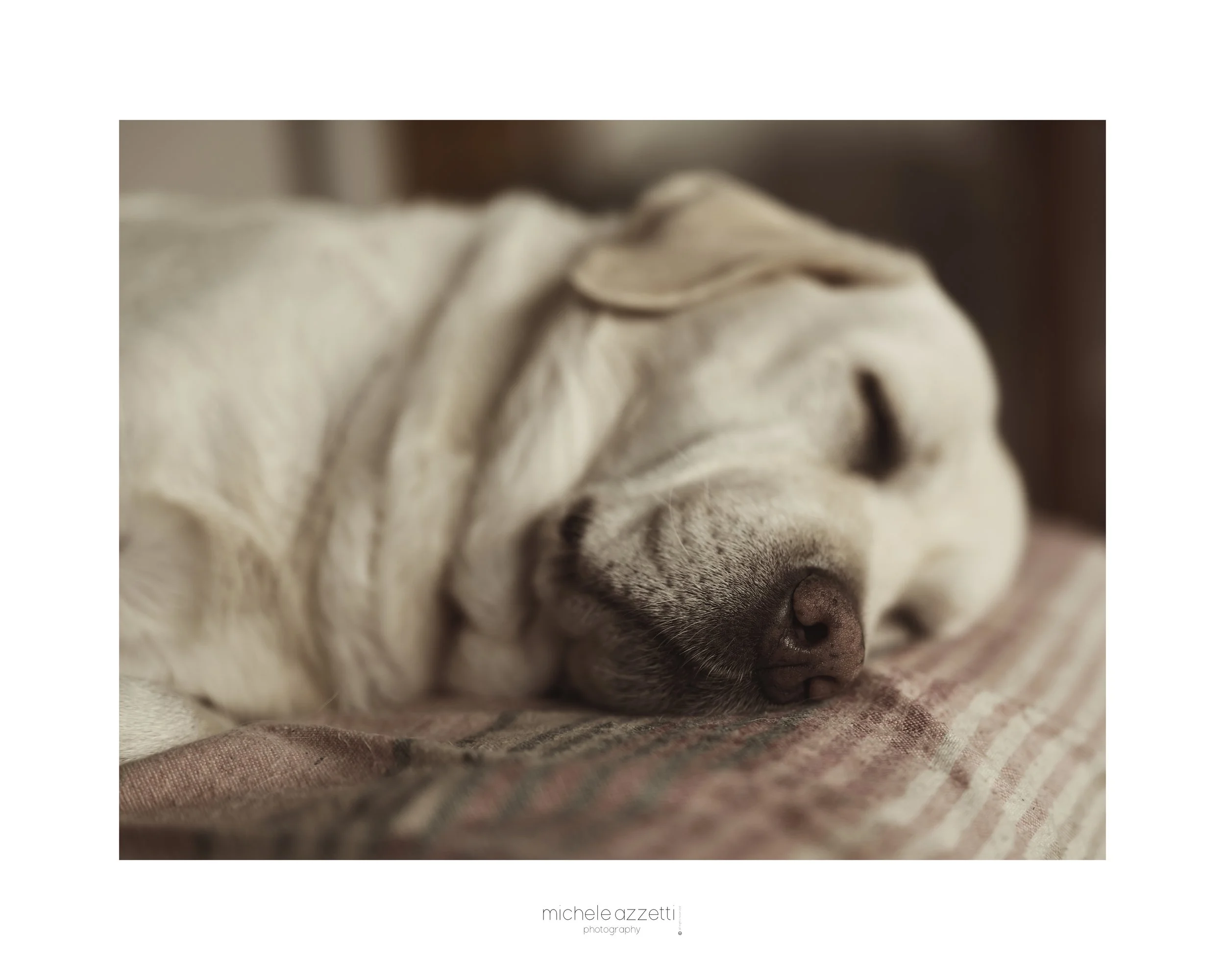 Un cane bianco sta dormendo sul divano, con gli occhi chiusi e il muso tranquillo.